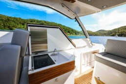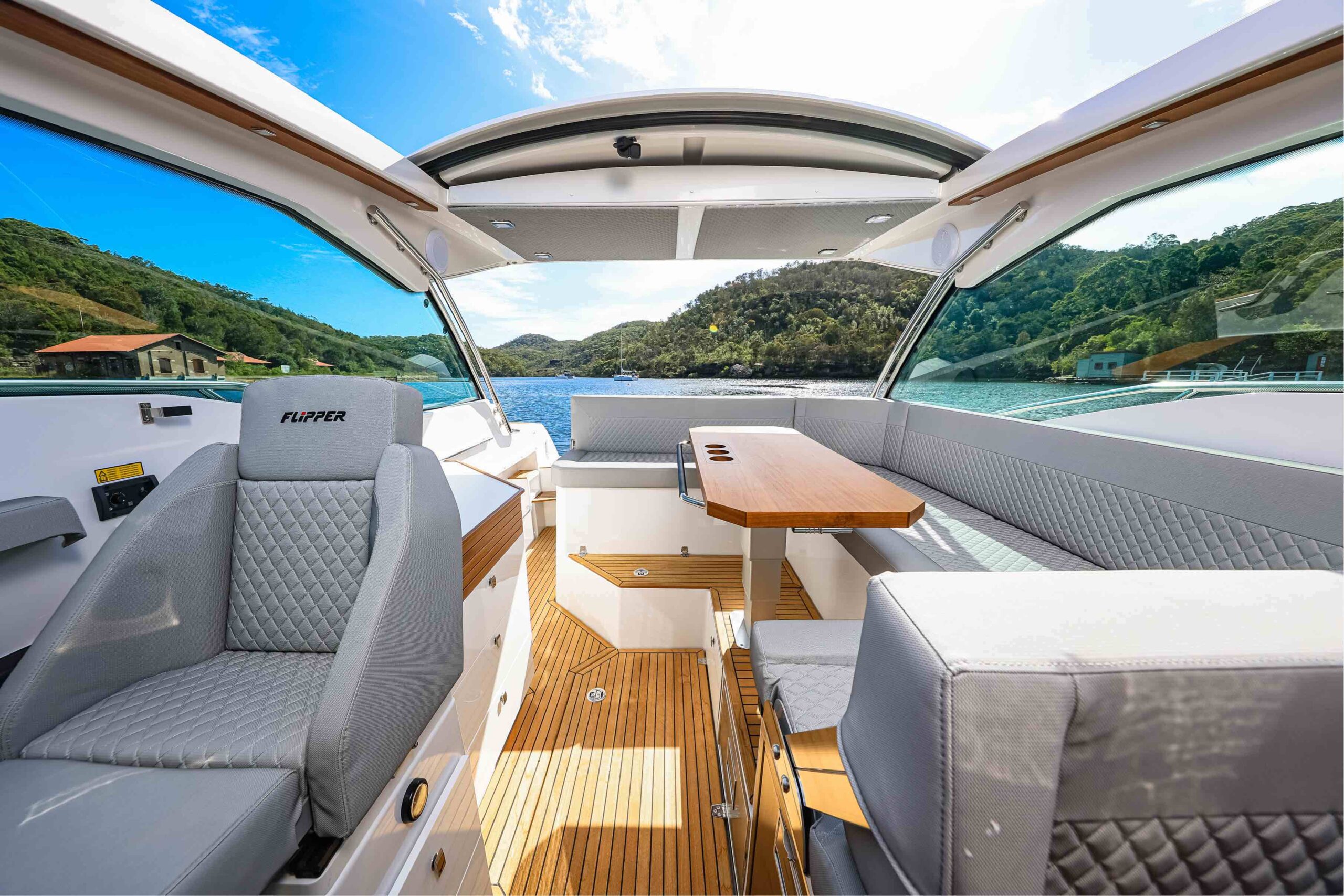 The new Flipper 900 ST allows you to enjoy the boat even in adverse weather conditions and low temperatures. With the large, electrically operated roof closed, a comfortable salon is created on deck. The heated interior extends the boating season, making it possible to spend a holiday on the water even in November. And when the sun comes out, you can bask in its rays, transforming the 900 ST into an open, sporty boat at the touch of a button.