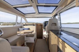Wnętrze modelu 365 oferuje prawdziwą jakość, z pięknym ciemnym wykończeniem mahoniu, które tworzy przyjemny kontrast do jasnych, lakierowanych powierzchni i dodaje poczucia ciepła. Dostępne jest też nowe wykończenie drewna Nordic Oak – dąb w połączeniu z nowym, beżowym kolorem tkaniny i nowym panelem dachowym w kolorze „antracytowym” nad deską rozdzielczą nadaje łodzi lekki, nowoczesny i elegancki skandynawski akcent.