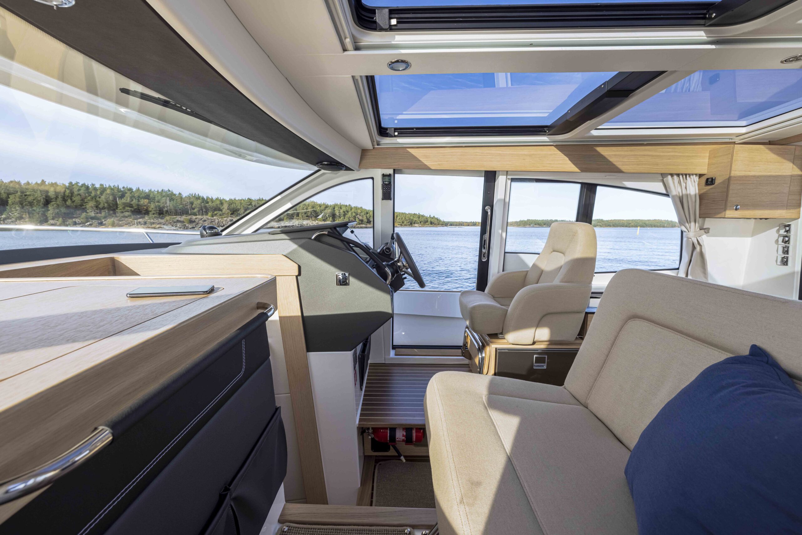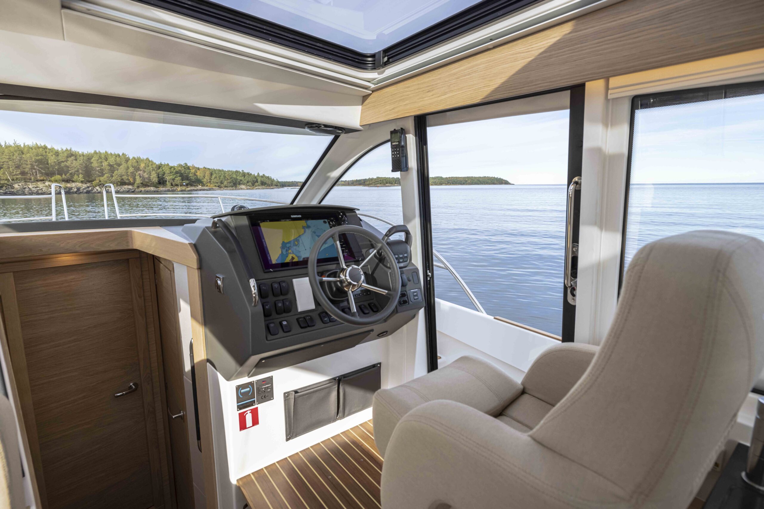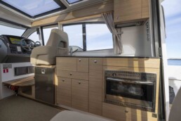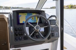 Kokpit ma: matowe wykończenia, które minimalizują odblaski, uchwyty zapewniające bezpieczeństwo w trudnych warunkach morskich oraz konfigurowalną tablicę przyrządów, którą można wyposażyć w jeden duży 16-calowy ploter lub dwa mniejsze modele. Wszystkie powierzchnie pokryto satynowym, odpornym na refleksy lakierem matowym, który redukuje odbicia i jest łatwy w utrzymaniu czystości.
