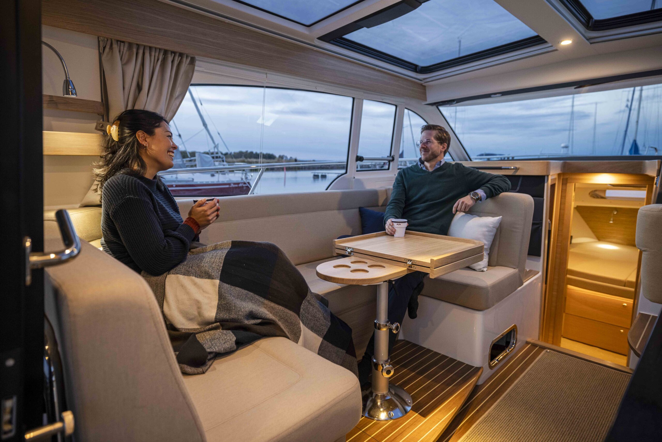 Łódź posiada dwie kabiny – główną oraz gościnną – z wspólną toaletą. Jedną z kluczowych innowacji jest wyposażenie obu kabin w wysokie szafy zwiększające przestrzeń do przechowywania. Ścianki działowe w każdej kabinie pokryte są lekkim, dźwiękochłonnym materiałem. Oświetlenie LED w całym wnętrzu jest starannie zaplanowane i tworzy przytulną atmosferę. Zintegrowana wentylacja znacząco poprawia cyrkulację i jakość powietrza.