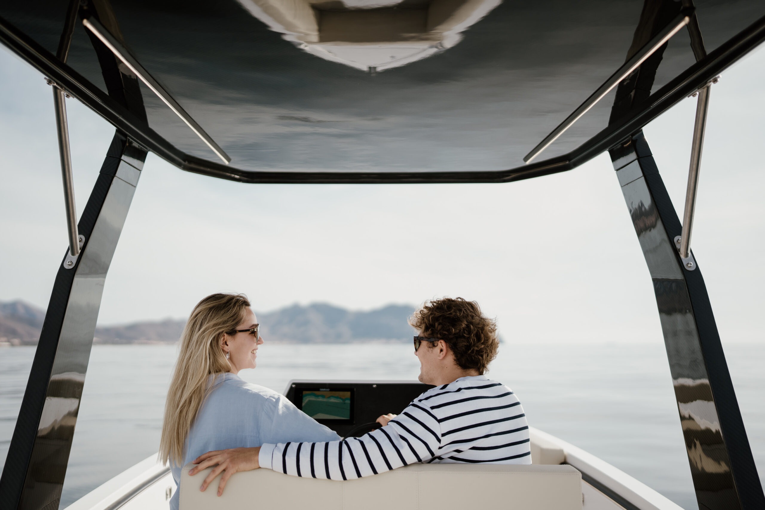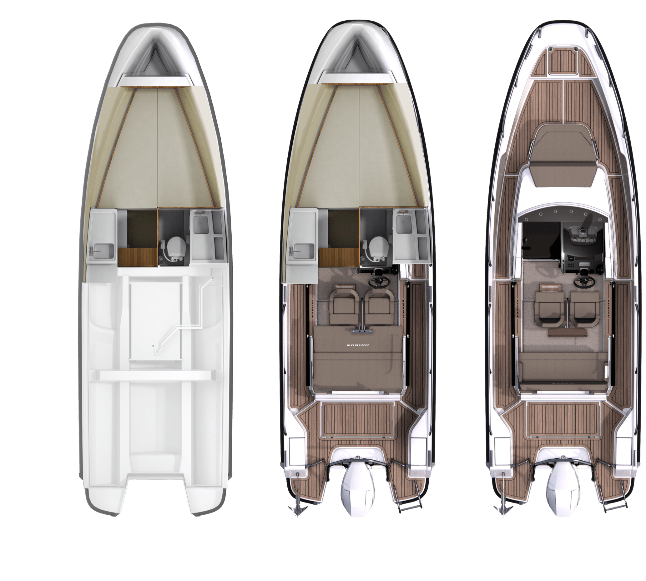 Zamiast standardowego szklanego dachu, łódź może być wyposażona w elektronicznie otwierane zadaszenie płócienne, które doskonale sprawdzi się dla osób pragnących maksymalnie wykorzystać uczucie otwartej przestrzeni podczas ciepłych, letnich dni. Stanowisko sternika mieści dwie osoby i może być wyposażone w pojedyncze plotery nawigacyjne 9″ lub 12″, albo podwójne 12″.