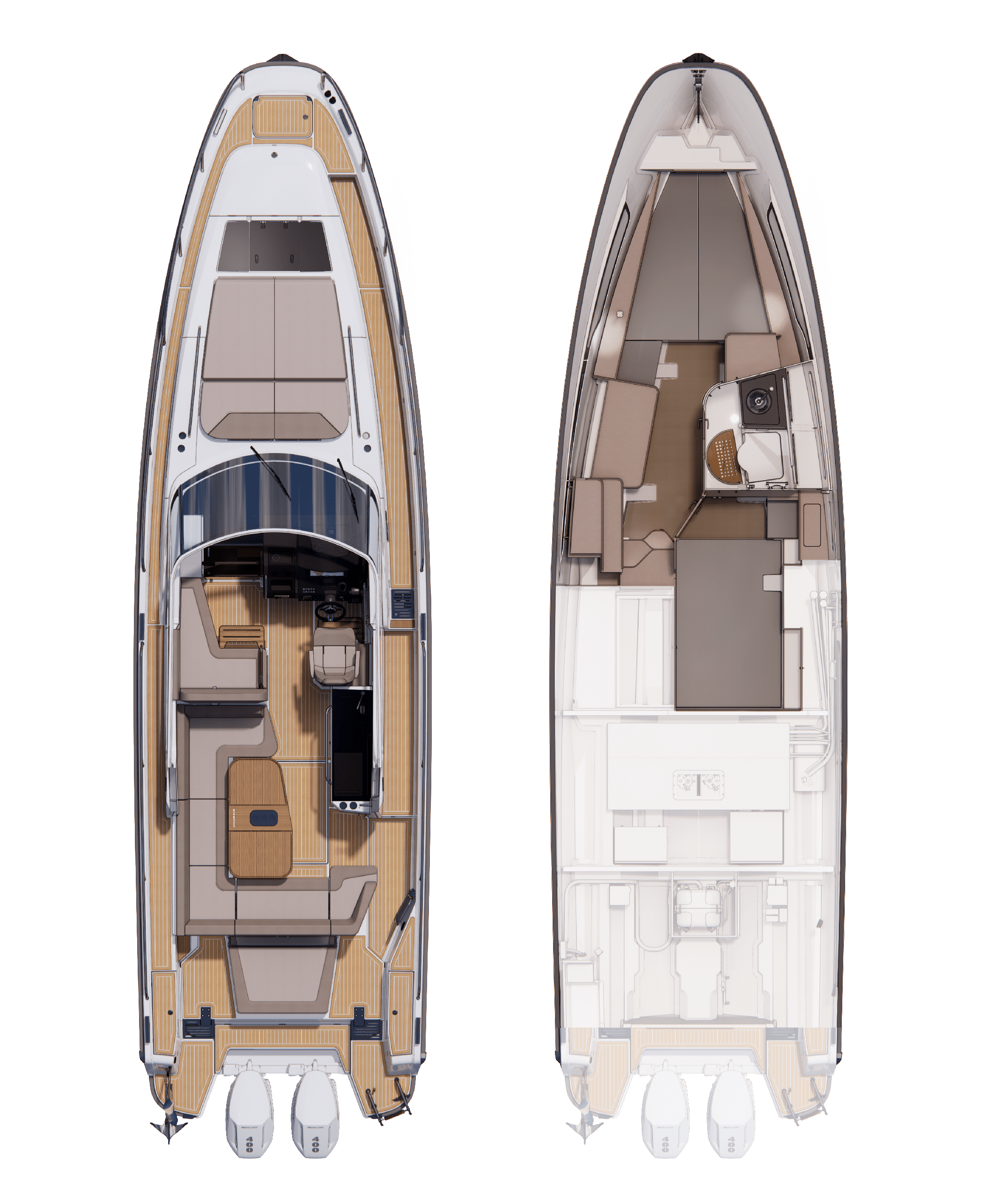 Pokład dziobowy oferuje duży luk załadunkowy z dostępem do kabiny, a także opcjonalne miejsce do leżenia, które można przekształcić w dodatkową strefę wypoczynkową dla czterech osób z opcjonalnym stołem lub powiększonym leżakiem. Na pokładzie rufowym znajduje się szeroka sofa z dużą przestrzenią do przechowywania.